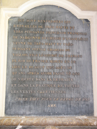 fils légitimé de Charles IX, morte en ce lieu le 10 août 1713, âgée de 92 ans , après avoir passé 68 ans de viduité