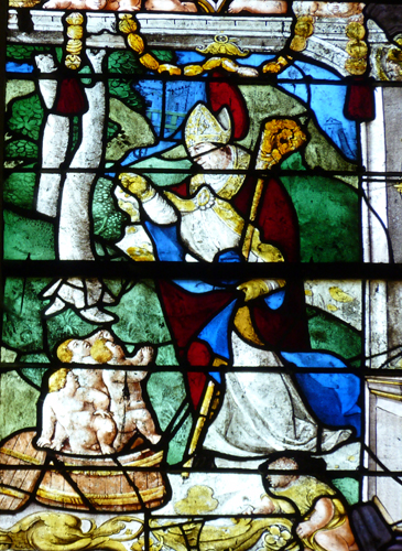 Parmi les traits les plus connus de sa légende figure la résurrection de trois enfants assassinés et mis au saloir par un aubergiste.